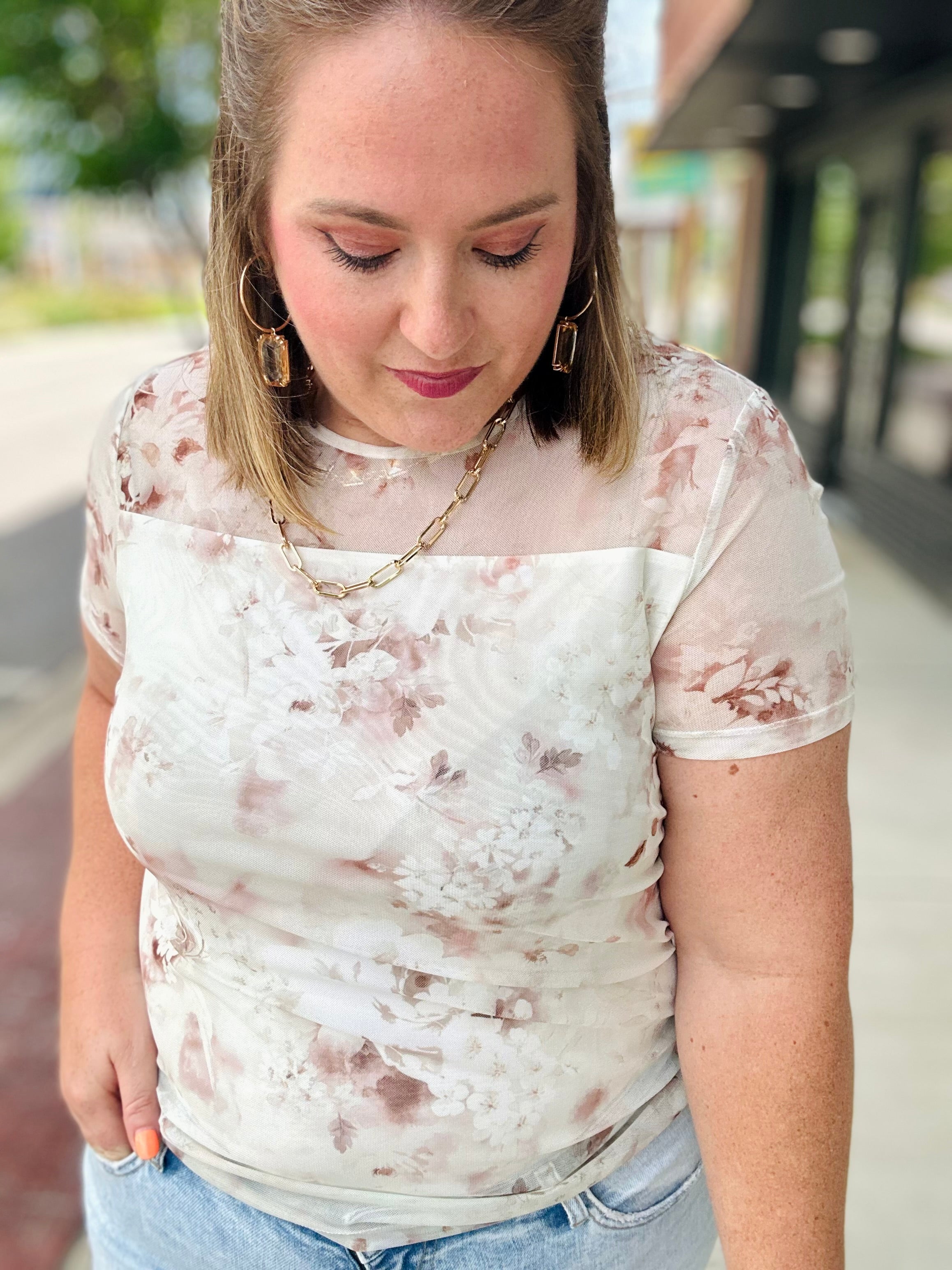 Get those 90s vibes with our True to Size Sheer Netted Top. The double lining and knitted mesh provide a comfortable and stylish fit. Short-sleeved with muted floral detailing for a subtle pop of color, this cream top will add a touch of nostalgia to any outfit. (Totally fetch, right?!)