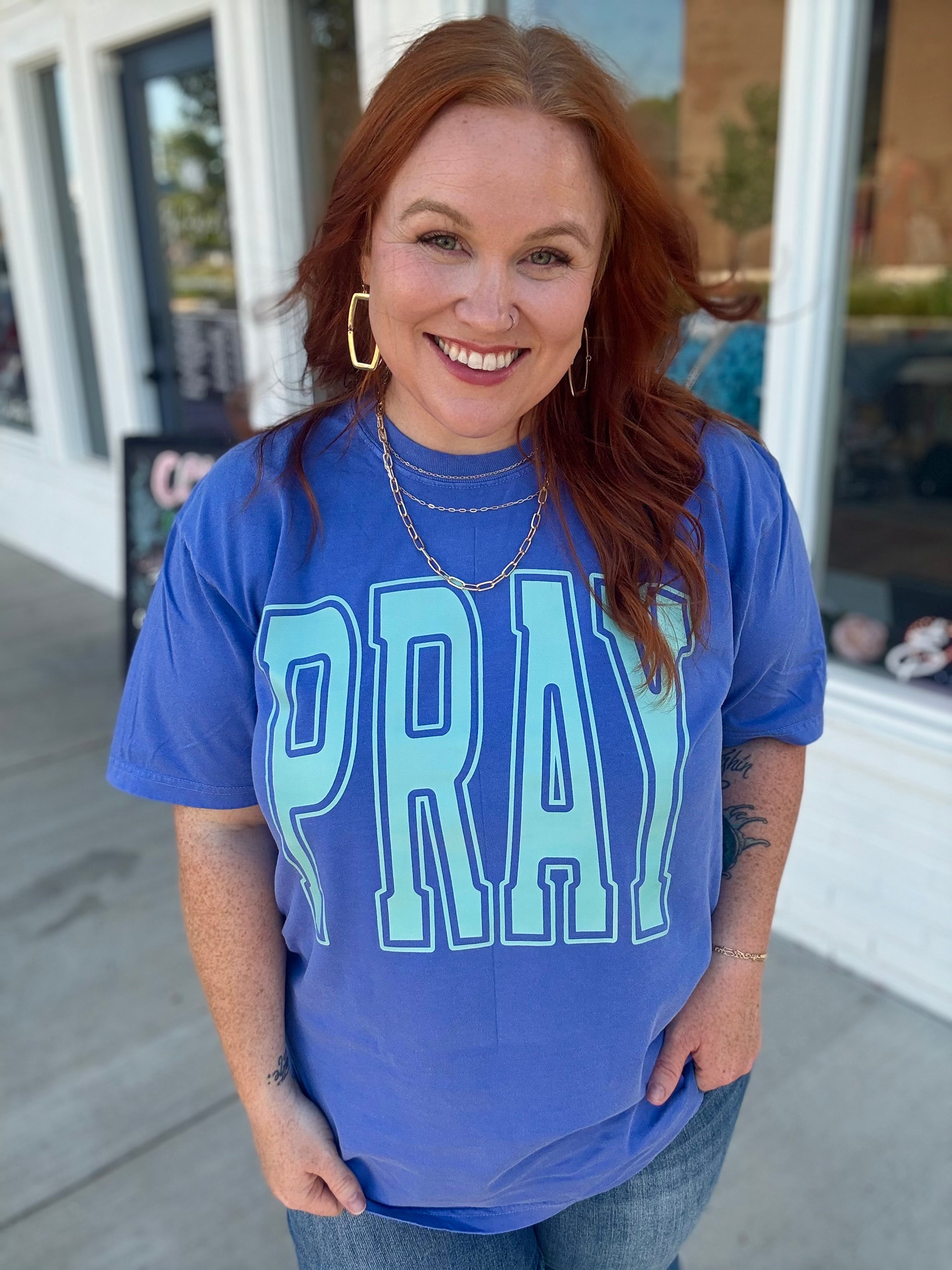 Printed and designed in house by us at Blue Rose on the comfort color periwinkle! We can’t get enough of a simple varsity print!