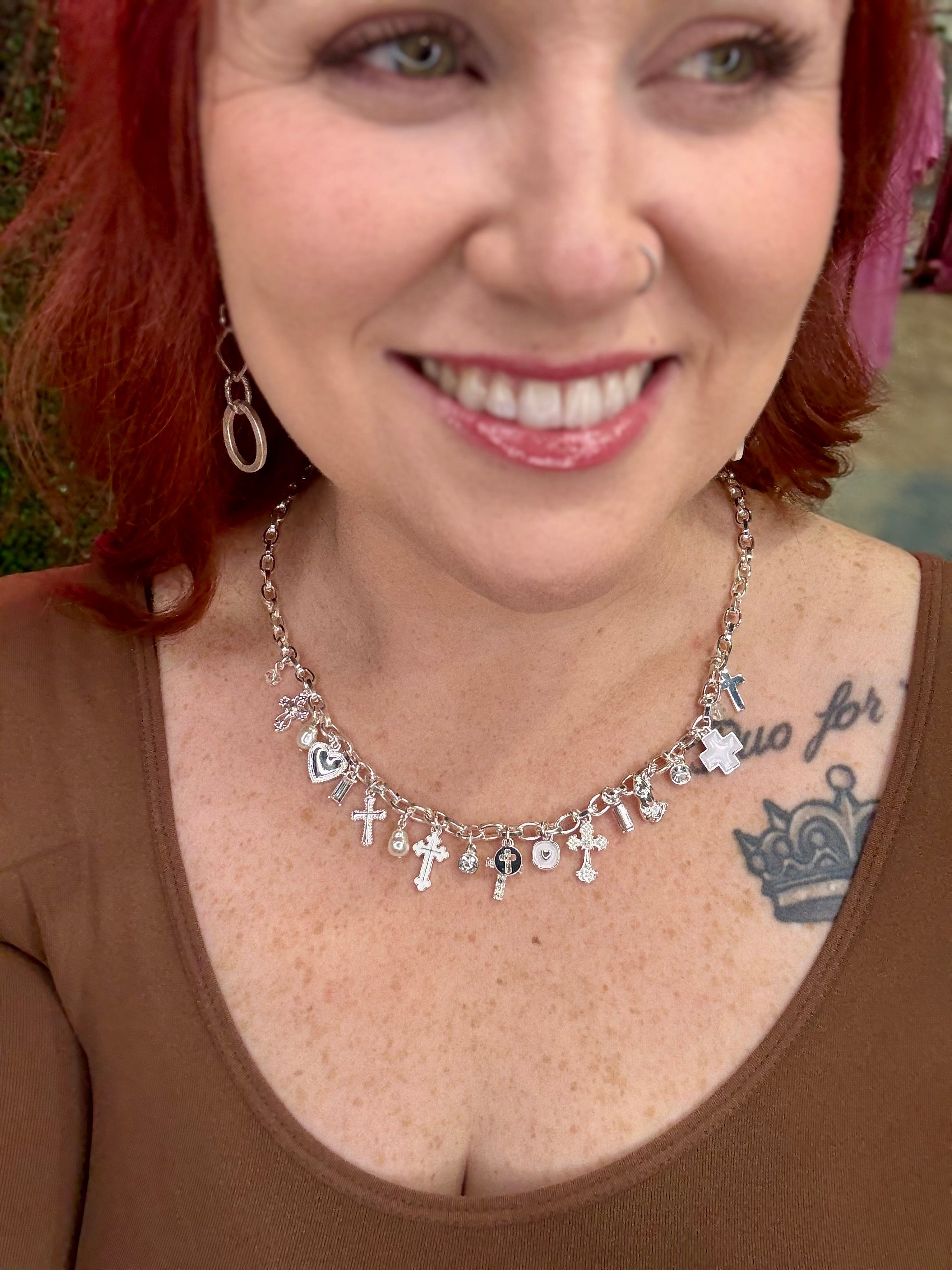 Add some charm to your outfit with our Silver Chain Link Charm Necklace! Made from high-quality silver, this necklace features a playful chainlink design that is sure to catch everyone's eye. Perfect for adding a touch of quirkiness to any outfit.